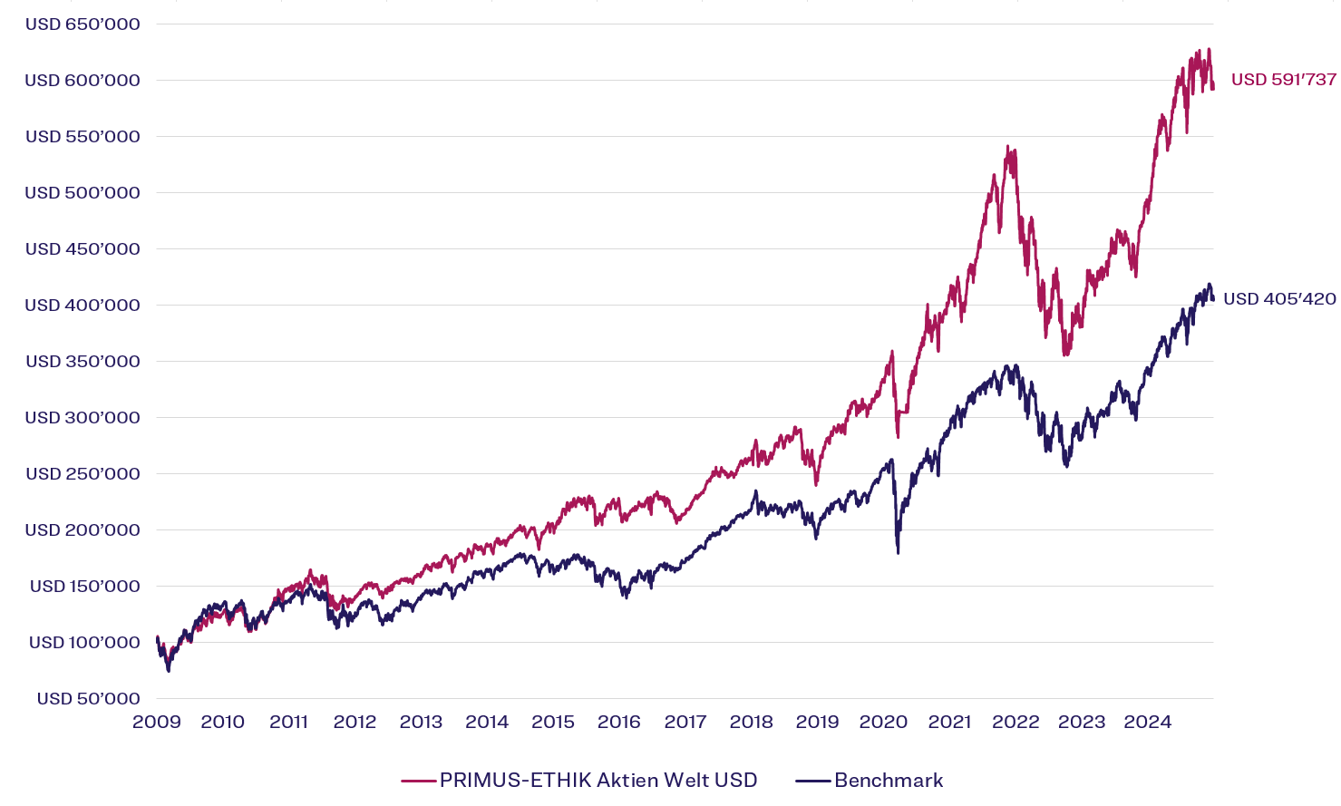 From 1 January 2009 to 31 December 2024, the mandate achieved a cumulative return of 491.74%, or 11.75% per year, in USD (before the deduction of fees and charges). This represents an almost fourfold increase in investment assets over 16 years. PRIMUS-ETHICS outperformed the benchmark by 186.32 percentage points..
