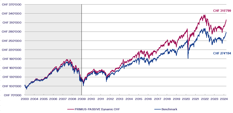 Using this procedure, we manage your assets from CHF 100,000.– onward for an attractive all-in fee. With PRIMUS-PASSIVE and depending on your personal risk-return profile, you can select two investment strategies in CHF, EUR and GBP and one investment strategy in USD. Your investment advisor will be pleased to submit a proposal.
