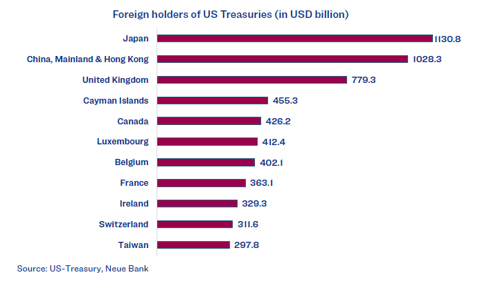 China and Japan are among the top holders of US government bonds. As a result, they could exert pressure on the USA in the context of the current tariff disputes. Some market commentators believe they have identified the Achilles’ heel of the USA here. A massive sale of these bonds could cause interest rates in the USA to rise and make the already high US debt servicing even more expensive, which would put the USA under pressure. Nevertheless, there are good reasons why these countries would not simply sell off their holdings. Such a move could not only destabilise the financial market but also damage their own economies. The pressure to sell would cause their currencies (JPY and CNY) to appreciate, which would make their exports more expensive and cause economic problems. In addition, US government bonds are an important reserve for both countries, which they do not want to give up easily as they serve as safe and liquid investments. In addition, the US Federal Reserve could intervene (it has reduced its Treasury holdings by over USD 1’500 billion since 2022) to stabilise the markets, which would mitigate the impact of a sale. And last but not least, such a move could significantly exacerbate geopolitical relations between the US, China and Japan – a risk that these countries also want to avoid. In short, while China and Japan have some negotiating power, the risks of a massive sale of US Treasuries are so high that escalation seems unlikely.