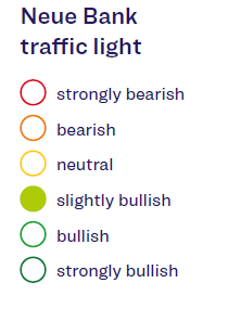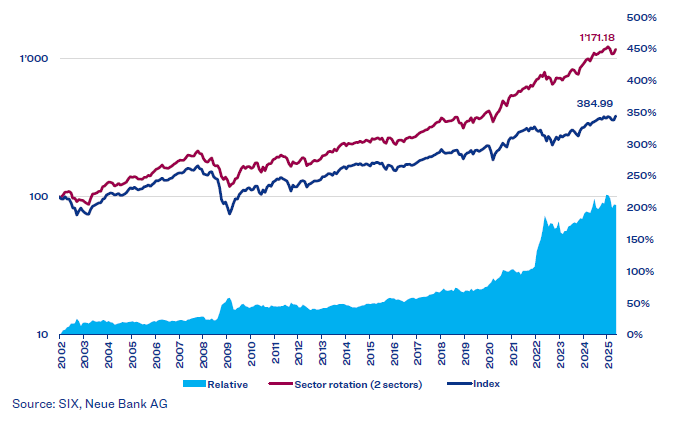 In addition to a positive return, the aim of an equity strategy is also to outperform the benchmark index. In order to ultimately achieve a positive performance, the longest possible time horizon is required. Over any 15-year period since 1975, the global equity market – even measured in CHF (the strongest of all currencies) – has never posted a negative performance. There are various methods for outperforming the market. One of these is to overweight equities compared to the benchmark. We manage this on the basis of our Neue Bank Ampel risk management system, which we also publish monthly in ‘Our Opinion’. In the past month, the assessment has improved and is currently light green (slightly bullish), which results in a slightly increased equity exposure. In addition to the different weightings of asset classes, we also utilise other strategies. For example, we are positioning ourselves in our favoured sectors: