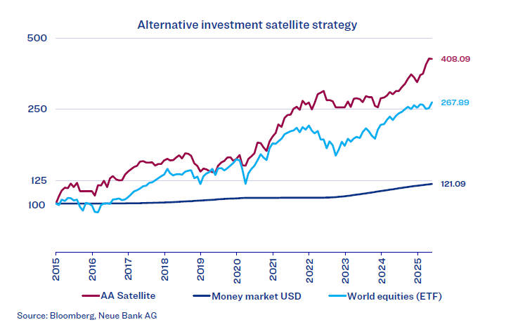 In addition to defensive core investments, which should generate the most stable returns possible regardless of the performance of bond and equity markets, we also pursue an active trading strategy with the satellite investments. In addition to the current investment in gold, ETFs on commodities, real estate, listed private equity and cash are also available as alternatives.