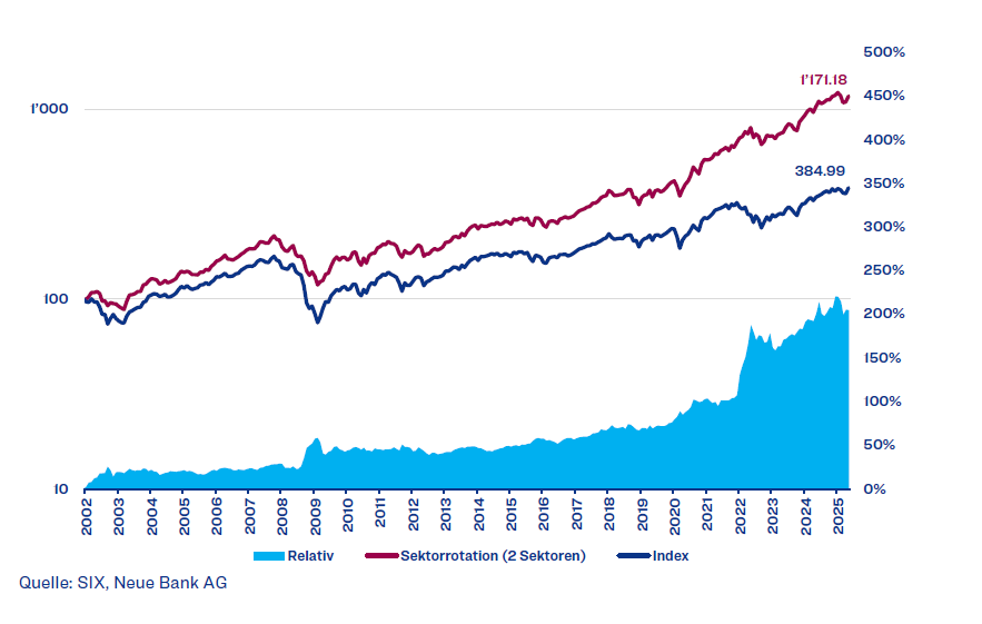 Um die Sektorindices auszuwählen, nehmen wir verschiedene Messungen vor. Ziel ist es, in einem Aufschwung möglichst in zyklischen Aktien investiert zu sein, um überdurchschnittlich von Kurszuwächsen zu profitieren. Umgekehrt soll bei länger anhaltenden Korrekturen möglichst früh in defensivere Papiere gewechselt werden. Aktuell sind wir in ETFs auf Kommunikationsdienstleistungen (z.B. Meta, Alphabet, Walt Disney oder Deutsche Telekom) sowie Finanzanlagen (Banken, Versicherungen und Finanzdienstleister) investiert. Gegen Ende des letzten Jahres haben wir diese Strategie implementiert. Der obige Chart zeigt, wie sich ein entsprechendes «Rotationsportfolio» mit den von uns definierten Regeln verhalten hätte.