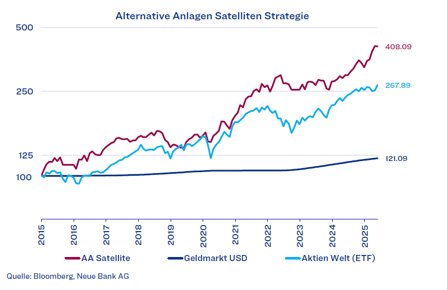 Neben defensiven Core-Anlagen, welche unabhängig von der Entwicklung von Obligationen- und Aktienmärkten möglichst stabile Erträge bringen sollen, verfolgen wir bei den Satelliten ebenfalls eine aktive Handelsstrategie. Neben der aktuellen Anlage in Gold, stehen auch ETFs auf Commodities, Immobilien, Listed Private Equity oder Cash als Alternativen zur Verfügung.