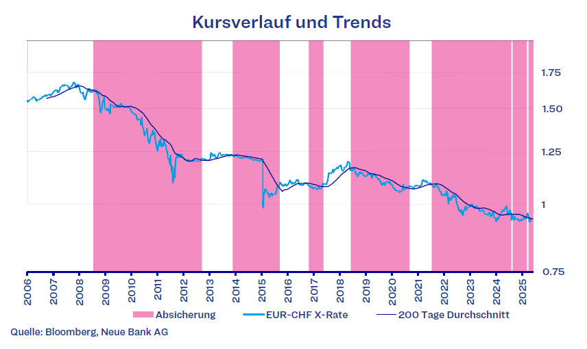 In Deutschland wurde die Schuldenbremse zuletzt gelockert, in der Schweiz wird eisern daran festgehalten. Dies ist einer der Gründe, warum der Schweizer Franken (CHF) äusserst fest notiert, gerade auch gegen den Euro (EUR). Um Währungsverluste einzudämmen, haben wir auch hier ein Handelsystem entwickelt, welches uns anzeigt, wann Währungsabsicherungen vorgenommen werden sollen: