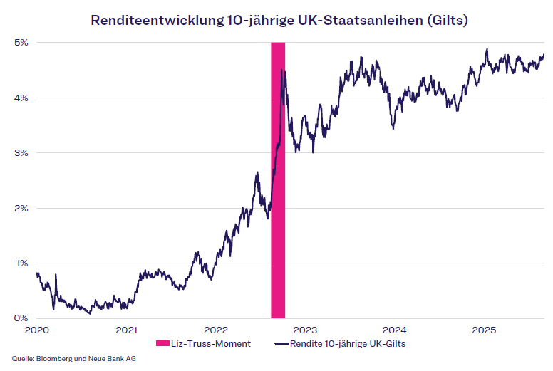 Das Vertrauen der Investoren in einen Staat lässt sich an der Entwicklung der Renditen der jeweiligen Staatsanleihen ablesen. Sinkt das Vertrauen in die Rückzahlungswahrscheinlichkeit, fallen die Preise von Staatsanleihen bzw. die Renditen steigen, weil Käufer höhere Risikoprämien erhalten wollen. Wie schnell dies geschehen kann, zeigt der Liz-Truss-Moment. Die damalige britische Premierministerin Liz Truss und ihr Finanzminister Kwasi Kwarteng präsentierten im September 2022 ein auf Schulden gebautes Steuersenkungsprogramm zur Ankurbelung des Wirtschaftswachstums. Die Bondinvestoren rechneten nun mit einer deutlich tieferen Rückzahlungs- wahrscheinlichkeit, trotz der guten britischen Bonität. Als Folge dessen gerieten die Preise der UK-Staatsanleihen ins Taumeln und die Renditen schossen in die Höhe. Beide Politiker mussten anschliessend zurücktreten.