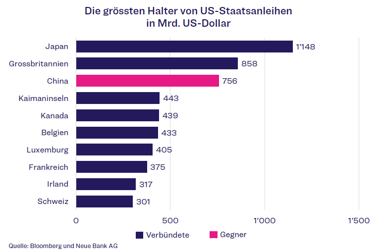 Befreundete Länder tendieren dazu, mehr Anleihen untereinander zu halten, weil enge politische und militärische Bindungen die Wahrscheinlichkeit von Konflikten und Enteignungen reduzieren. Doch der Konfrontationskurs von Donald Trump schädigt das Vertrauen und folglich die Beziehungen. Käme es zu einem deutlichen Abbau der Bestände durch die Verbündeten, dürfte dies weitere Verluste für den Greenback zur Folge haben.